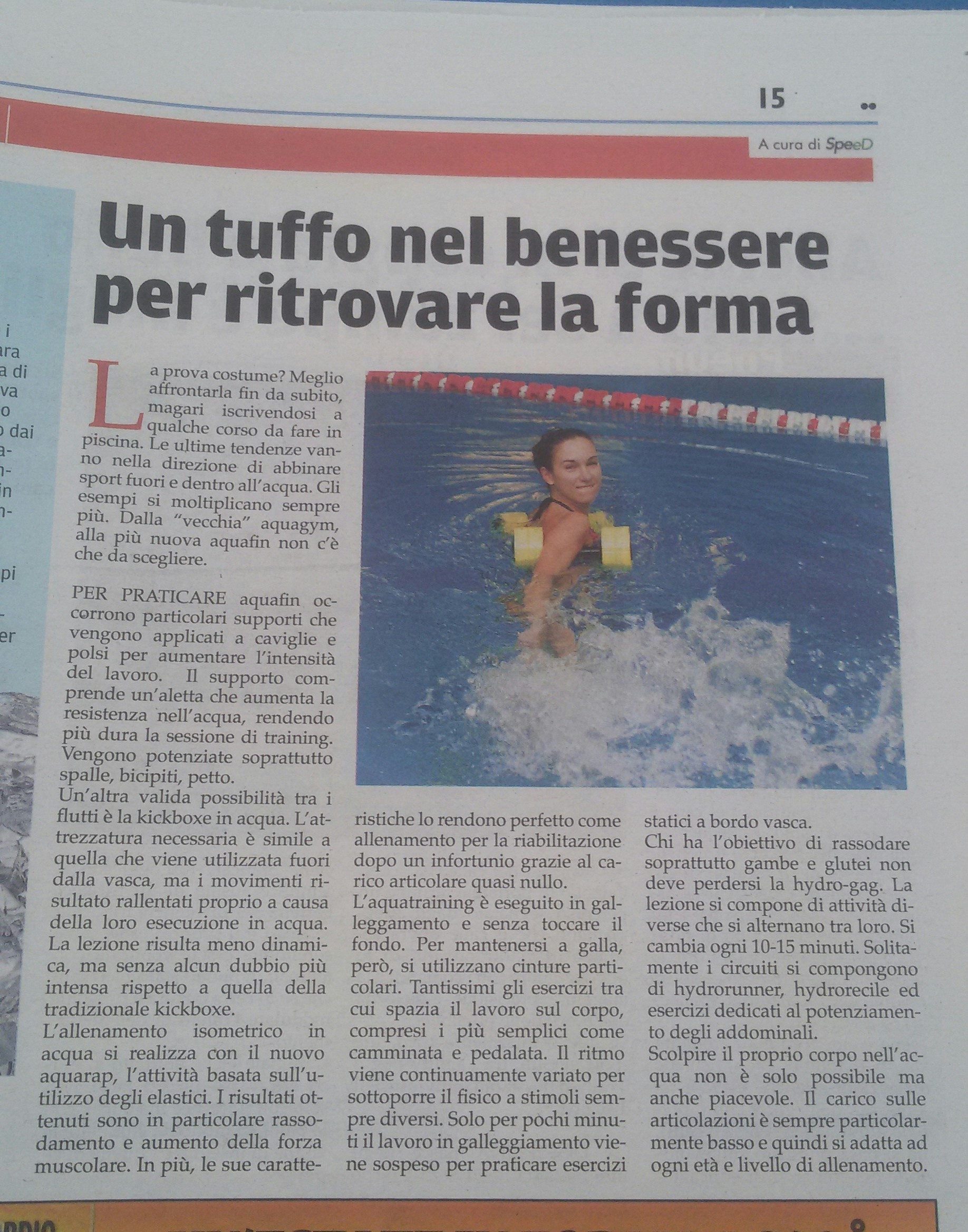 “La prova costume? Meglio affrontarla fin da subito, magari iscrivendosi a qualche corso da fare in piscina. Le ultime tendenze vanno nella direzione di abbinare sport fuori e dentro all’acqua. Gli esempi si moltiplicano sempre di più. Dalla “vecchia” aquagym, alla più nuova aquafin non c’è che da scegliere.